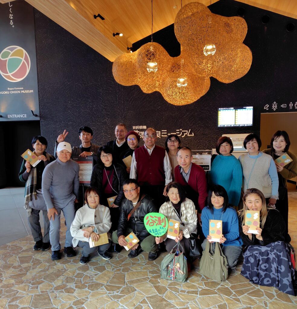 博多駅と小倉駅で合流し、貸し切りバスで別府へ。車内では、まるで学生時代に戻ったかのように、笑い声と懐かしい話が飛び交いました。昼食には名物「地獄蒸し」を味わい、鉄輪温泉では地獄めぐりや温泉ミュージアムを巡って、アメリカ研修の思い出話にも花が咲きました。