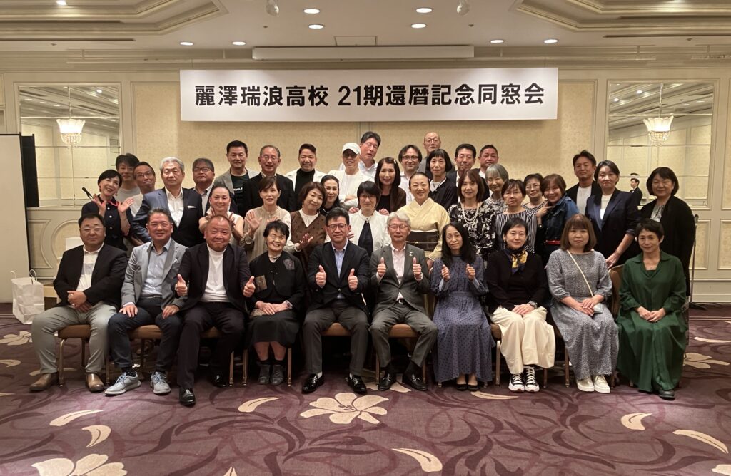 10月18日(土)に名古屋東急ホテルで21期の還暦同窓会を開催し、同級生42名と恩師の松田興一先生と、原田先生の奥様のさつき様にご参加いただき、盛会となりました。昨年の秋から1年の間に、同級生4名が亡くなったので、会の冒頭に皆で故人のご冥福を祈りました。その後はいつもの懐かしい面々と楽しい、懐かしい話で盛り上がりました。美味しい料理とお酒を共にした後には、記念同窓会という事で、参加者から協賛品の賞品を出していただき、番号によるお楽しみ抽選会を開催し、協賛いただいた方からは、自分の仕事関係の品物や、商品券やエステ券、高価な品や地域の特産品、次回同窓会招待券などが提供され、当たりの程度に差はあれど、全員に何かしらの賞品が当たりました。あっという間に1次会が終了し、部屋を変えて2次会へ・・32名もの方が参加し、部屋は熱気に包まれ、その場では、全員に還暦記念の赤い帽子とちゃんちゃんこを着た写真を撮ってもらいました。好評でした。2次会ではより突っ込んだ話で盛り上がり、楽しい夜を過ごしました。3次会には19名が参加し、日付が替わる頃に終了しました。今回は還暦記念という事で、5年毎の開催から外れましたが、次回は3年後、2028年の秋に開催予定です。参加していただいた皆さん有り難うございました。(幹事:奥田誠)